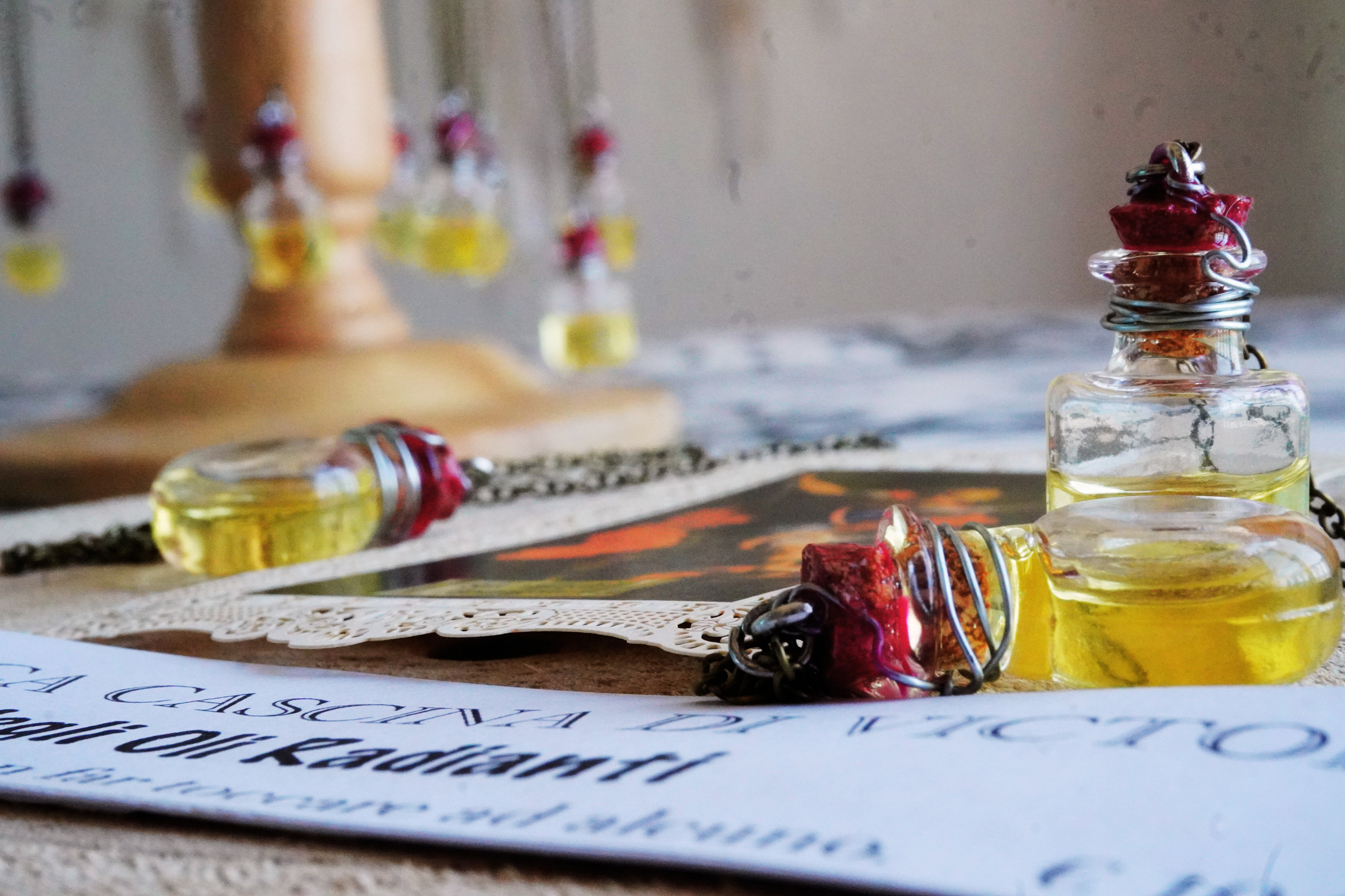 Ho creato l'aromaterapia in piccole boccette di olii leggeri, usando esclusivamente essenze naturali al 100% biologiche. Per diffondere il profumo, basta aggiungere alcune gocce di olio di mandorla o albicocca, preferibilmente spremuti a freddo.